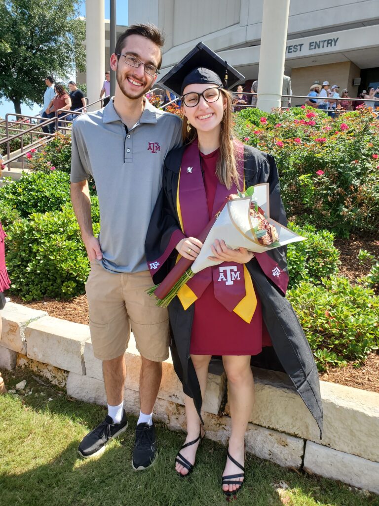 The next week was a whirlwind of exciting activities, dates, and final exams. On December 12, 2023 they finally made it official: they were boyfriend and girlfriend. The following semester, they sought out every opportunity to study, play board games, and be intentional with each other. Over spring break, Ellie brought Carson home with her to San Antonio to meet her parents and show her hometown to him. That spring semester was full of exciting firsts and lasts, as it was their first semester of dating and Ellie’s final semester at A&M. Before she graduated, Ellie got to participate in many senior traditions, but the most special, was Ring Dance. Ellie graduated from TAMU with a Bachelor of Science in Wildlife & Fisheries Conservation Sciences.
