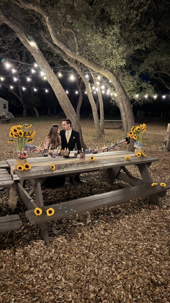 Carson suggested that they wear their ring dance outfits to attend his buddy’s event. He later asked Ellie if she’d like to have a fancy dinner date before the event, as that night marked their 16th month of dating. They had a lovely dinner together, and the waiter even brought out a special dessert without prompting! It wasn’t until they were parking at Cibolo Nature Center that Ellie started to suspect anything. As they walked through the dimly lit area, the lights in the trees turned on to reveal a beautiful arrangement of sunflowers and photographs from throughout their dating season. Carson guided Ellie from picture to picture, ending the moment with some Spirit-led words. He got down on one knee and as he presented the ring, Ellie didn’t hear him ask the question! Confused, she placed the ring onto her finger and said “Yes!”, but this time, Carson didn’t hear her! Laughing about the confusion, they began to dance. Music played nearby, and his friends hid in the shadows to photograph and record the moment. (Thank you dearly to Robeam, Joni, and Blaine for capturing such an important memory for us!)